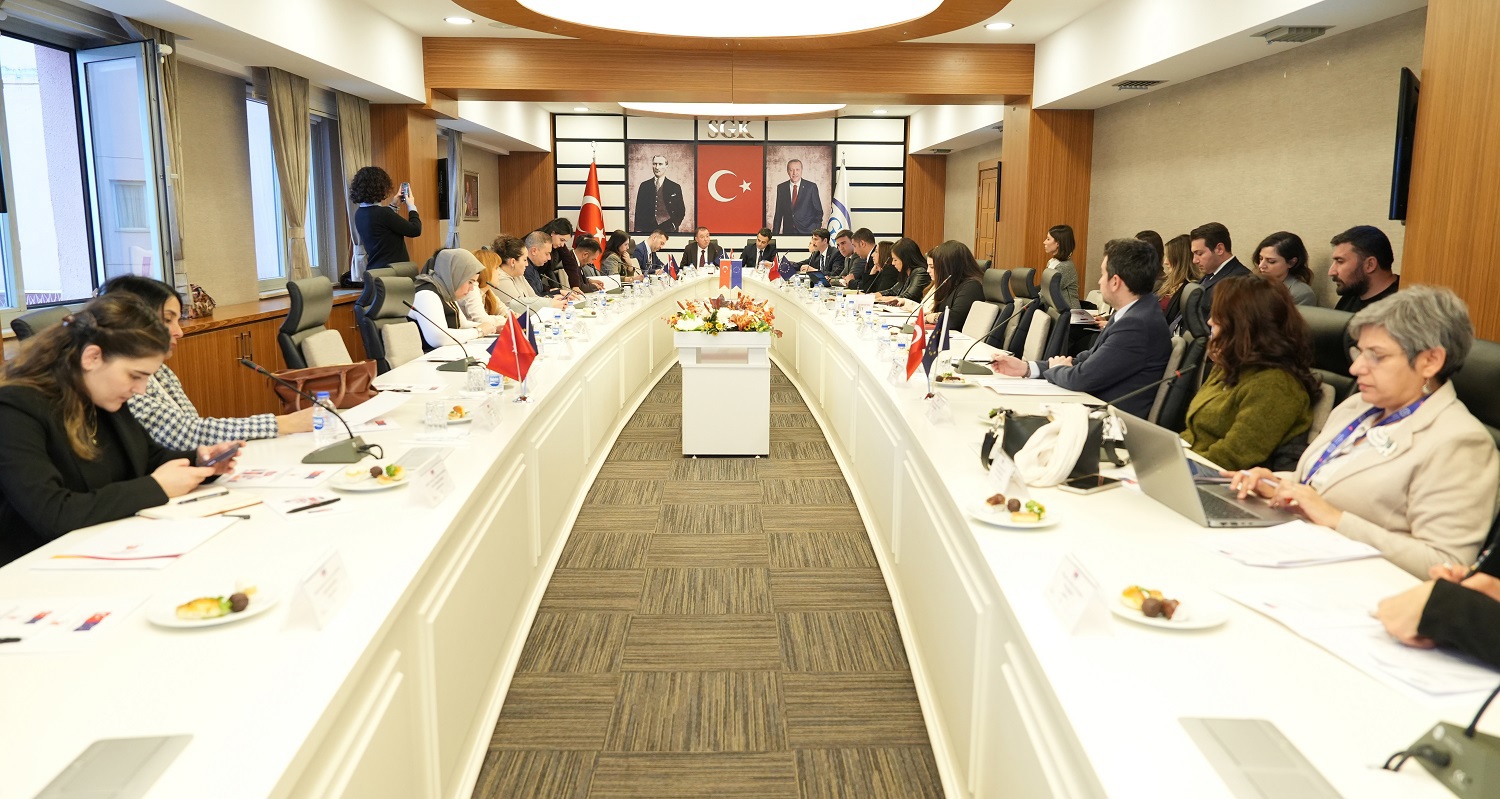 SGK Neşet Ertaş Toplantı Salonu’nda yapılan toplantıya, Çalışma ve Sosyal Güvenlik Bakanlığı Dış İlişkiler ve Avrupa Birliği Genel Müdürlüğü Genel Müdür Yardımcısı Ersoy Günay, SGK Strateji Geliştirme Başkanlığı Avrupa Birliği ve Dış İlişkiler Daire Başkanı Sedat Budak ile ilgili bakanlık, kurum, kuruluşlardan temsilciler ve akademisyenler katıldı.